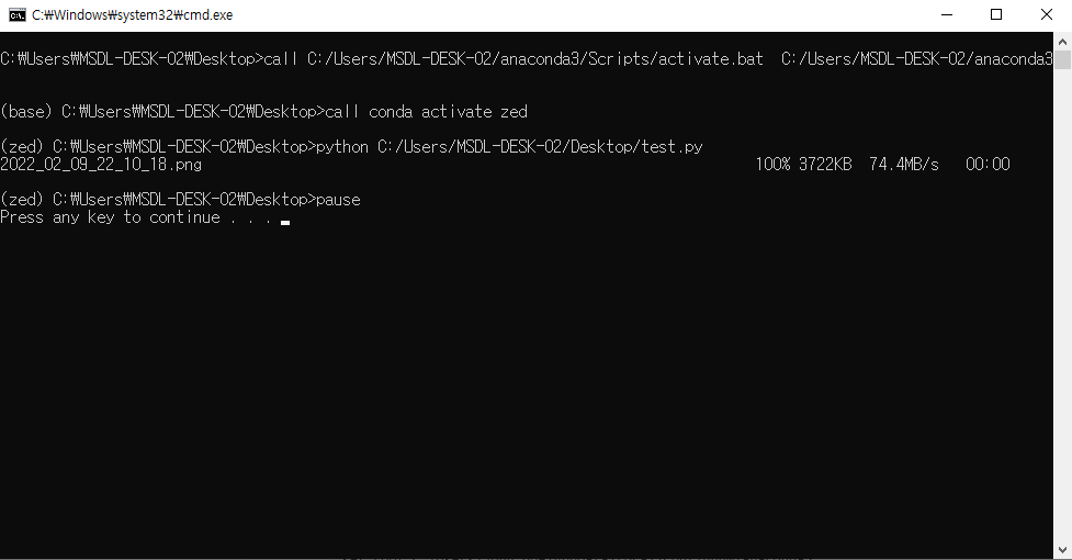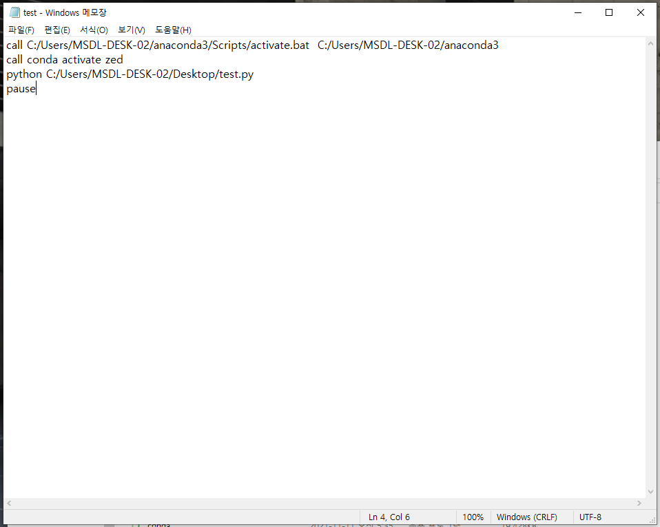 2. 아나콘다 가상환경 상에서 python file을 실행하기 위해 아래와 같이 작성한다.