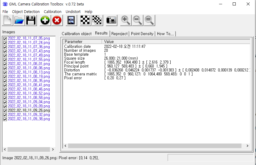 참고로, 동일한 카메라로 캘리브레이션을 수행했을 때, 이미지 해상도를 1/2로 낮추면 캘리브레이션 결과의 초점거리도 1/2로 작아집니다. 실제 물리적 초점거리가 변하는 것은 아니지만 카메라 모델에서의 초점거리는 상대적인 개념이기 때문에 해상도를 바꾸면 한 픽셀(pixel)에 대응하는 물리크기가 변하고 따라서 초점거리도 변하게 됩니다. 예컨데, 이미지 해상도를 1/2로 낮추면 이미지 센서의 2 x 2 셀(cell)들이 합쳐서 하나의 이미지 픽셀이 되기 때문에 한 픽셀에 대응하는 물리크기가 2배가 됩니다. 따라서 초점거리는 1/2이 되어야 합니다.