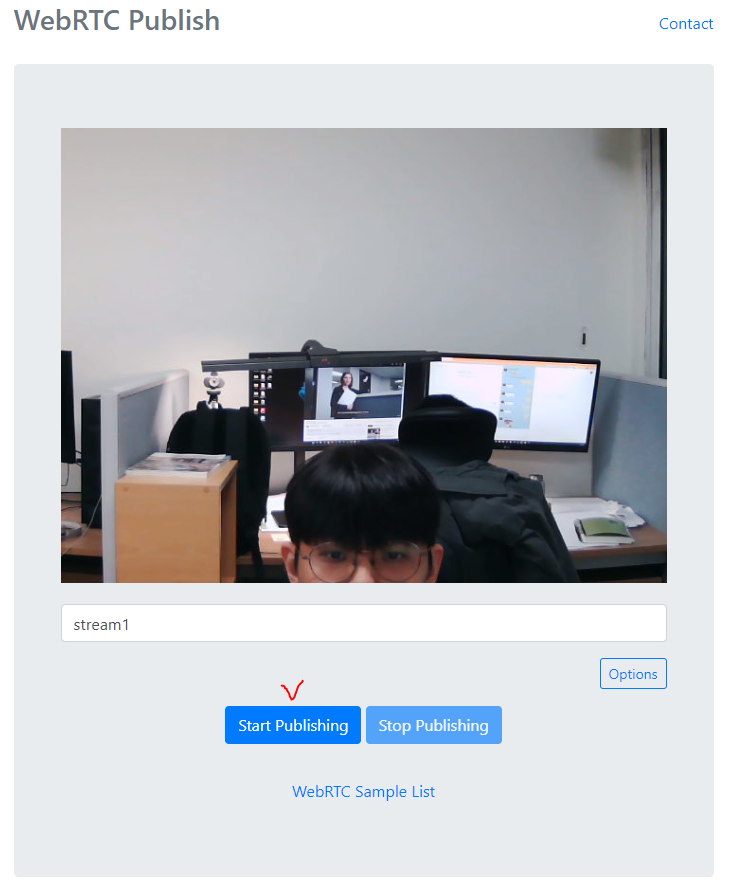 이렇게하면 제 로컬PC에 연결된 webcam 영상이 Ant Media Server(중개서버)로 보내집니다.