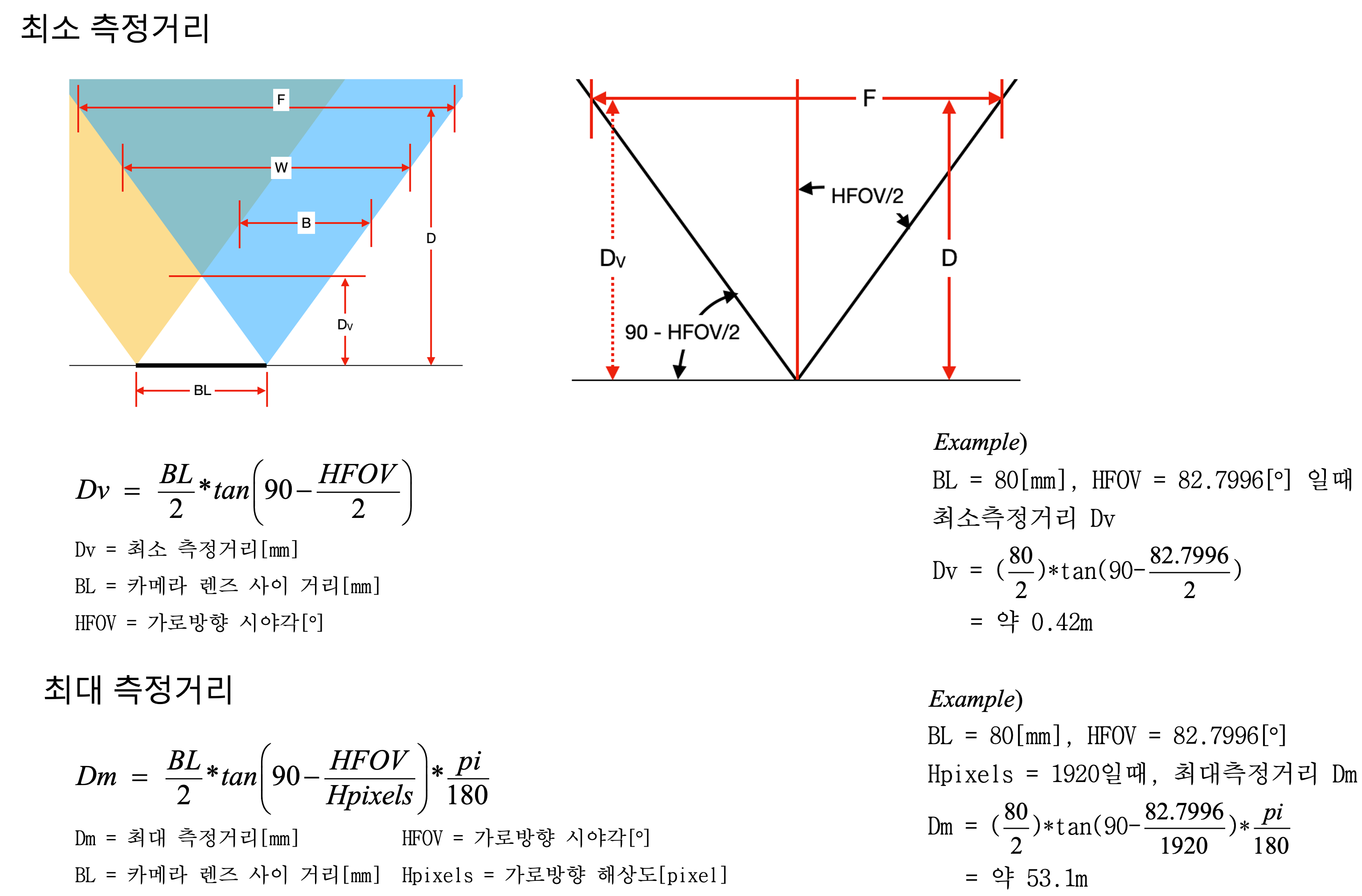 위 공식은 수학적으로 스테레오 카메라의 측정 범위를 계산하는 방법입니다. 스테레오 카메라의 깊이측정 범위는 카메라 렌즈 사이 거리, 카메라 화각, 카메라 해상도 3가지에 의해 결정됩니다. 예를들어 저희와 같이 1920x1080 해상도에 카메라 가로방향 해상도가 82.7996도일 때 0.4m의 최소 동작범위를 설정하기 위해서는 카메라 렌즈 사이 거리가 80mm가 필요합니다. 이에따라 임베디드보드에 탑재될 두 개의 카메라 렌즈 사이의 거리는 80mm로 결정하였습니다.