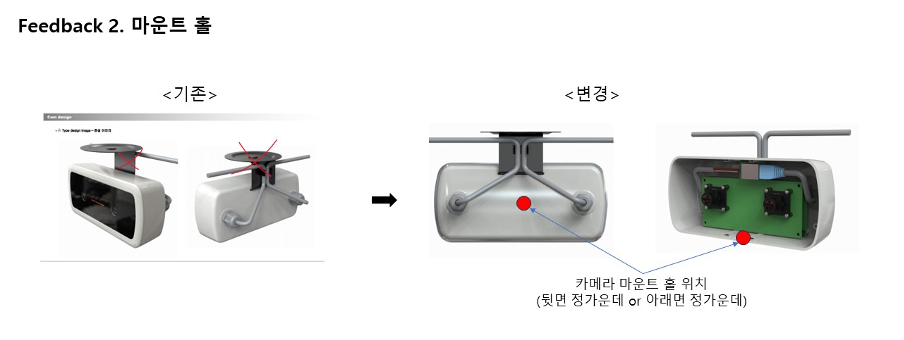 - 카메라 마운트: 카메라는 바닥을 바라보는 방향으로 설치되므로 하우징 후면부가 천장과 마운트될 수 있도록 마운트 홀 위치 고려해야 함