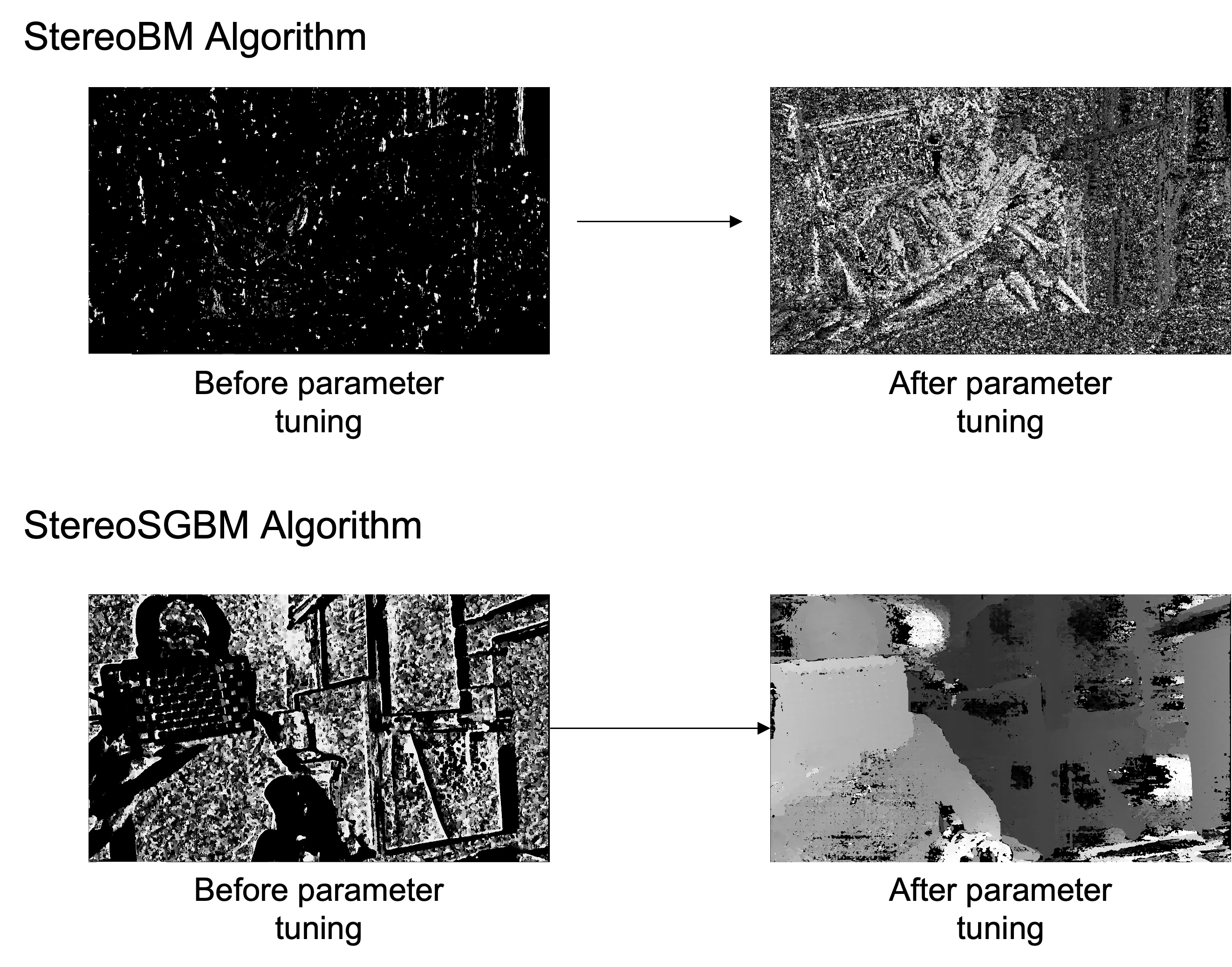 stereoBM과 stereoSGBM 알고리즘을 통해 생성된 Disparity map을 살펴보면 위 그림과 같이 파라미터튜닝 전/후 stereoSGBM 알고리즘이 더 정확한 Disparity map을 생성한 것을 볼 수 있었습니다. 두대의 카메라로 촬영한 이미지를 통해 실시간으로 생성되는 Disparity map의 FPS는 stereoBM이 10.9, stereoSGBM이 3.1이었습니다. 이와같이 속도 측면에서는 stereoBM이 우수했지만, 저의 경우 실시간성을 보장하지 않아도 되었기 때문에 정확도가 더 높은 stereoSGBM 알고리즘을 선택하였습니다.
