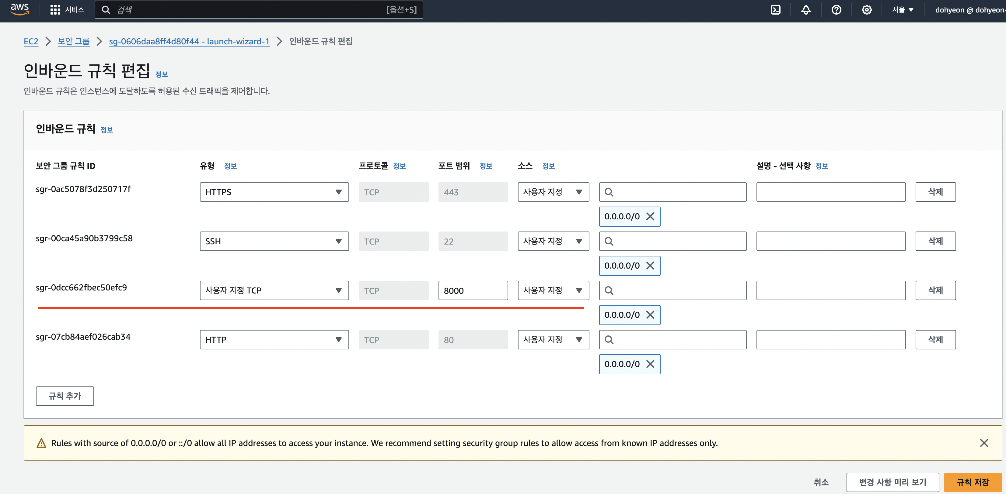 - AWS에서 8000번 port를 인바운드 규칙에 추가합니다.