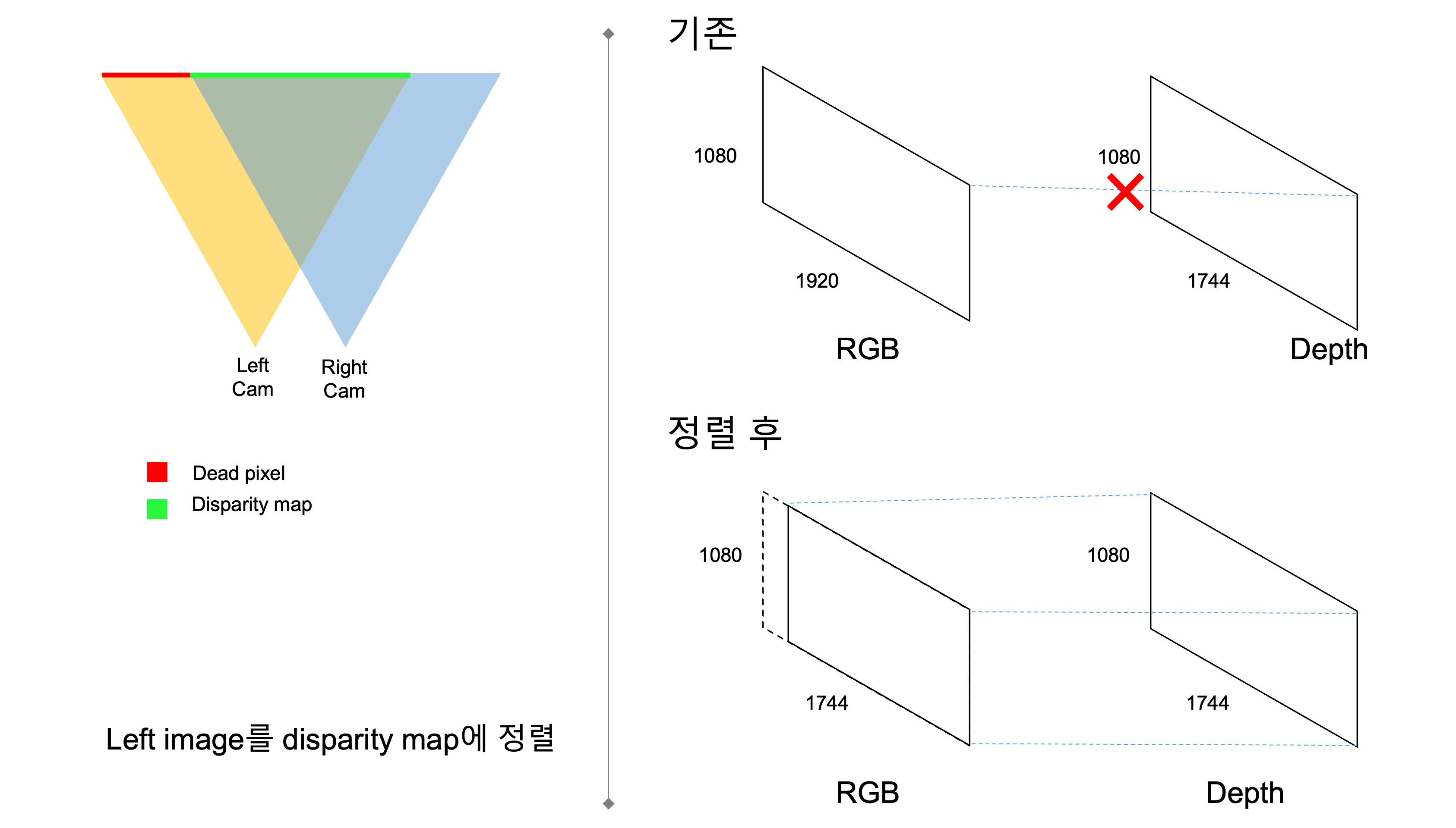 최종 목표인 RGB 이미지에서 segmentation된 특정 픽셀까지의 z축 거리를 계산하기 위해서는 RGB frame과 Depth frame이 1:1 정렬되어야 했습니다. 그래서 저는 아래 그림과 같이 왼쪽 카메라 센서에서 촬영된 RGB 이미지에서 numDisparity값만큼 픽셀을 Crop하여 RGB frame과 Depth frame을 1:1 mapping시켰습니다. 이를 통해 RGB 이미지에서 segmentation된 특정 픽셀들까지의 실제 Z축 거리를 계산할 수 있었습니다.