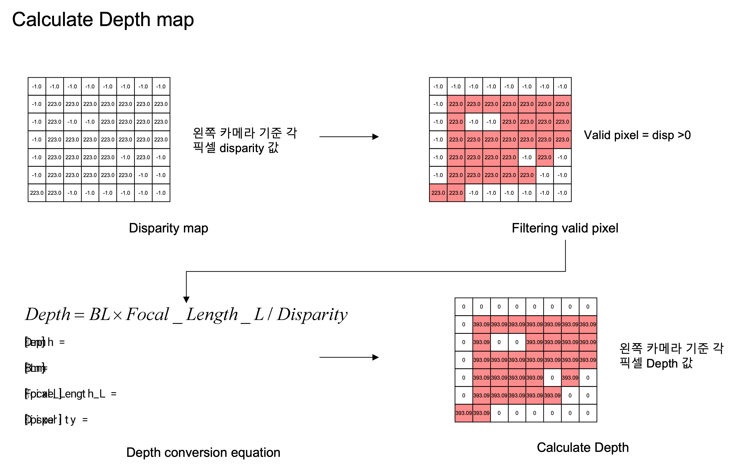 후처리까지 마친 Disparity map을 이용하여 Depth map을 생성할 수 있습니다. 앞서 생성된 각 픽셀의 Disparity value는 float32 자료형의 -1~numDisparity 범위의 값입니다(이때, 유효한 픽셀값 범위는 0~numDisparity). 이 값을 이용해 Depth map을 계산하는 방법은 다음과 같습니다.