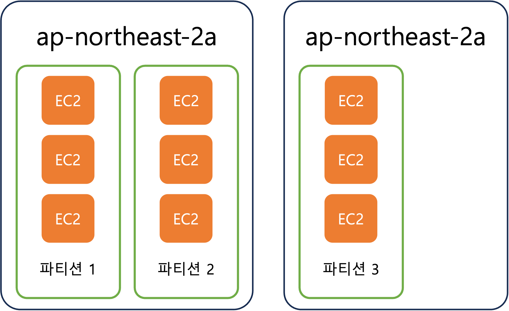 - 분할 배치그룹: 분산 배치그룹처럼 인스턴스를 여러 AZ로 분산시키는 것은 동일하지만, 동일 AZ안에서 여러 파티션을 생성하여(~7개) 최대 수백 개의 인스턴스를 생성할 수 있는(분산 배치그룹의 단점을 보완한) 전략입니다. 아래 그림과 같이 하나의 파티션 내의 인스턴스는 다른 파티션의 인스턴스와 동일한 하드웨어 랙을 공유하지 않으므로 하나의 랙에서 실패가 발생하더라도 애플리케이션은 안정적으로 실행됩니다.