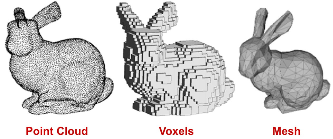 - Point Cloud는 점들의 밀집도가 균일하지 않은 불규칙한 특성을 갖고 있습니다. 아래 그림은 각각 Point Cloud, Voxel, Mesh로 표현한 토끼입니다.