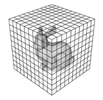 - 예를들어, Point Cloud를 Voxel로 변환하면 Voxel Grid 안에 빈공간이 많이 생겨서 데이터가 매우 커지는 문제가 발생합니다. 아래 그림과 같이 토끼 한마리를 Voxel로 표현하려면 3D 행렬을 사용합니다. 하지만 대부분의 공간은 비어있으므로 불필요한 데이터 처리가 발생하게 됩니다.