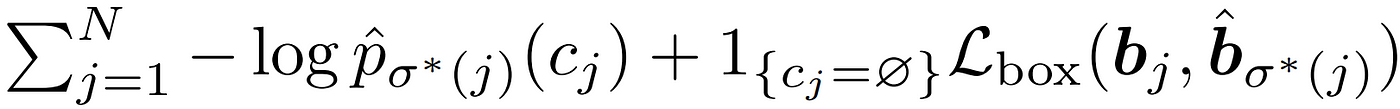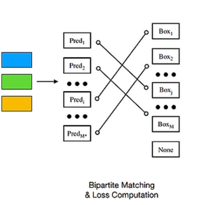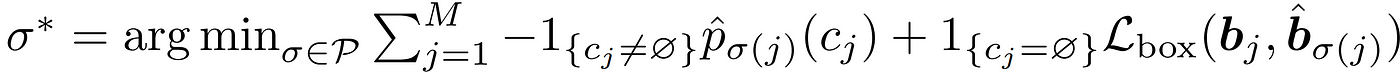 이렇게 갯수를 맞춰준 뒤 GT와 예측값 사이 Set-to-set Loss를 계산하려면 예측값과 GT 사이의 최적의 짝궁을 찾아줘야 합니다. 짝궁을 찾는 과정은 Bipartite Matching(이분 매칭)을 통해 수행되고 수식은 아래와 같습니다.