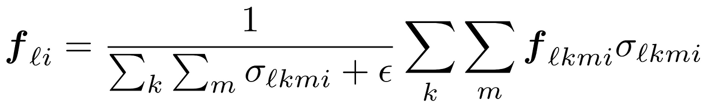 잘 생각해보면 특정한 3D 참조점이 모든 이미지에 Back-projection되지 않습니다. 그래서 저자는 이러한 경우를 다루기 위해 0과 1을 갖는 σlkmi를 도입하였습니다. 3D 참조점이 해당 이미지에 Back-projection되면 1, 아니면 0값을 갖습니다. 아래 식을 이용하면 여러 개의 Feature map에서 구한 여러 개의 Feature들을 통합하고 최종 Feature Fli를 구할 수 있습니다.