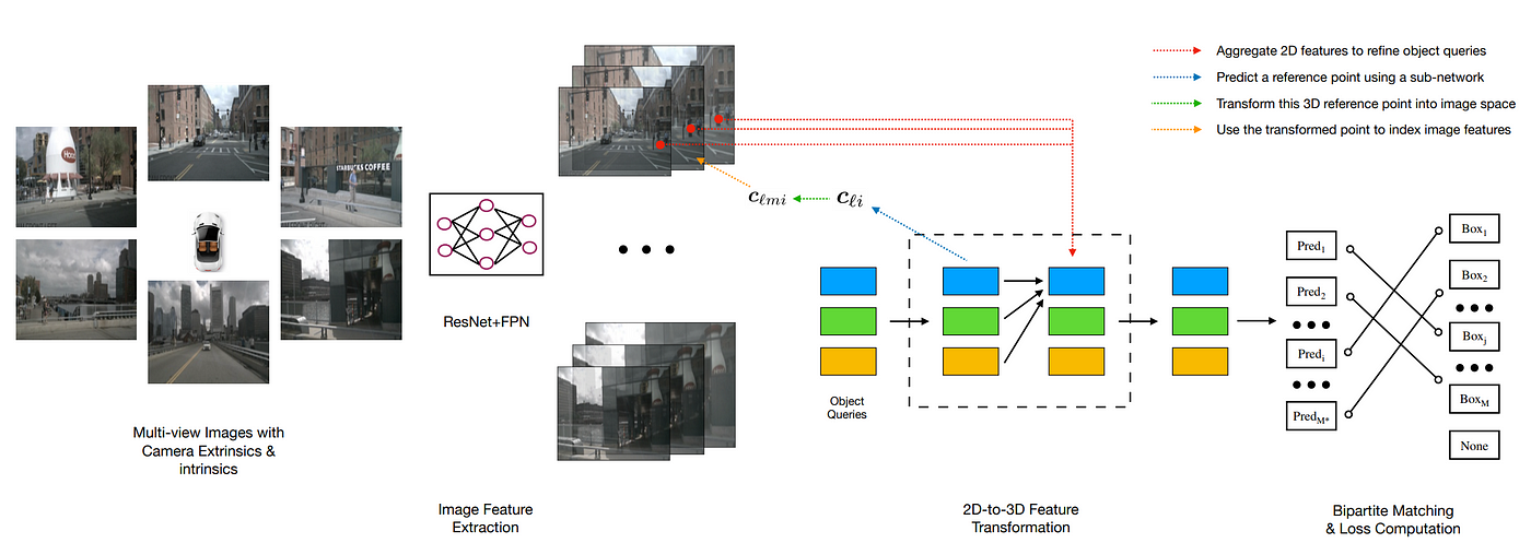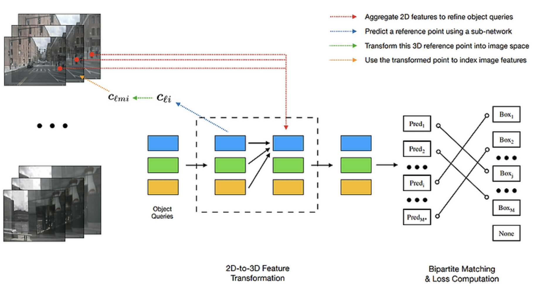 - Detection Head: 2D feature로부터 3D BBox를 생성하는 모듈입니다. 이를 위해 Transformer 구조와 3D 쿼리를 사용하였습니다.