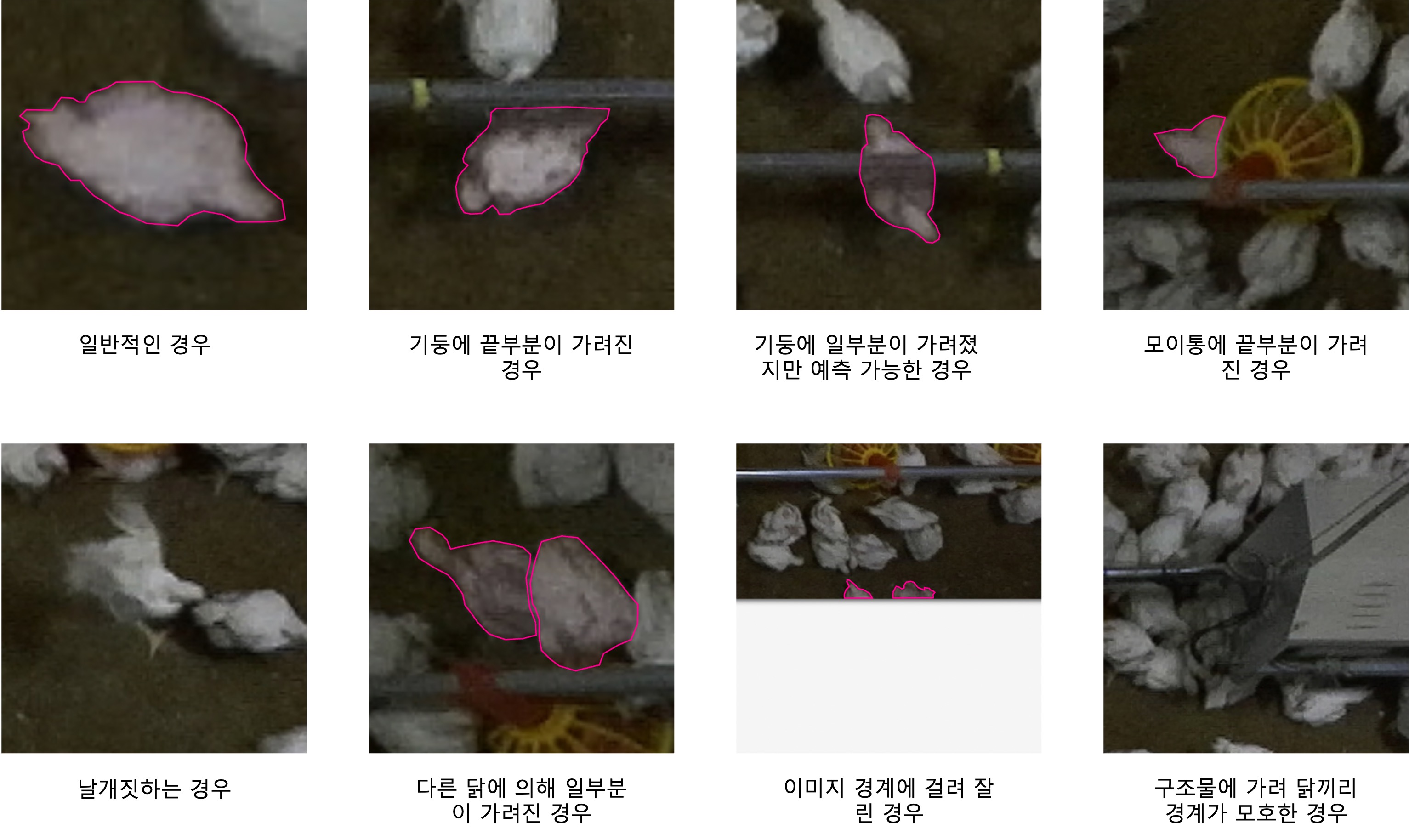- 구조물에 가려 닭끼리 경계가 모호한 경우 segmentation 모델에 의해 검출되지 않도록 라벨링하지 않는다.