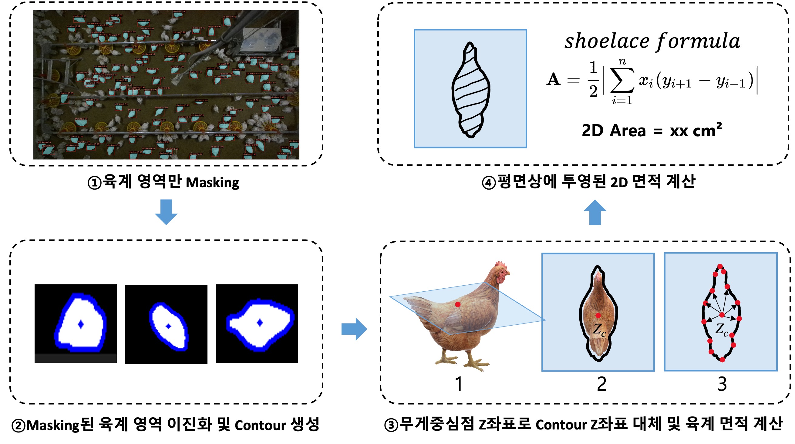 변환된 contour points의 Z좌표를 무게중심점의 z 좌표로 대체하고 좌표평면 상에서 꼭짓점의 좌표를 알 때 다각형의 면적을 계산할 수 있는 shoelace formula를 적용하여 다각형의 면적을 계산합니다.