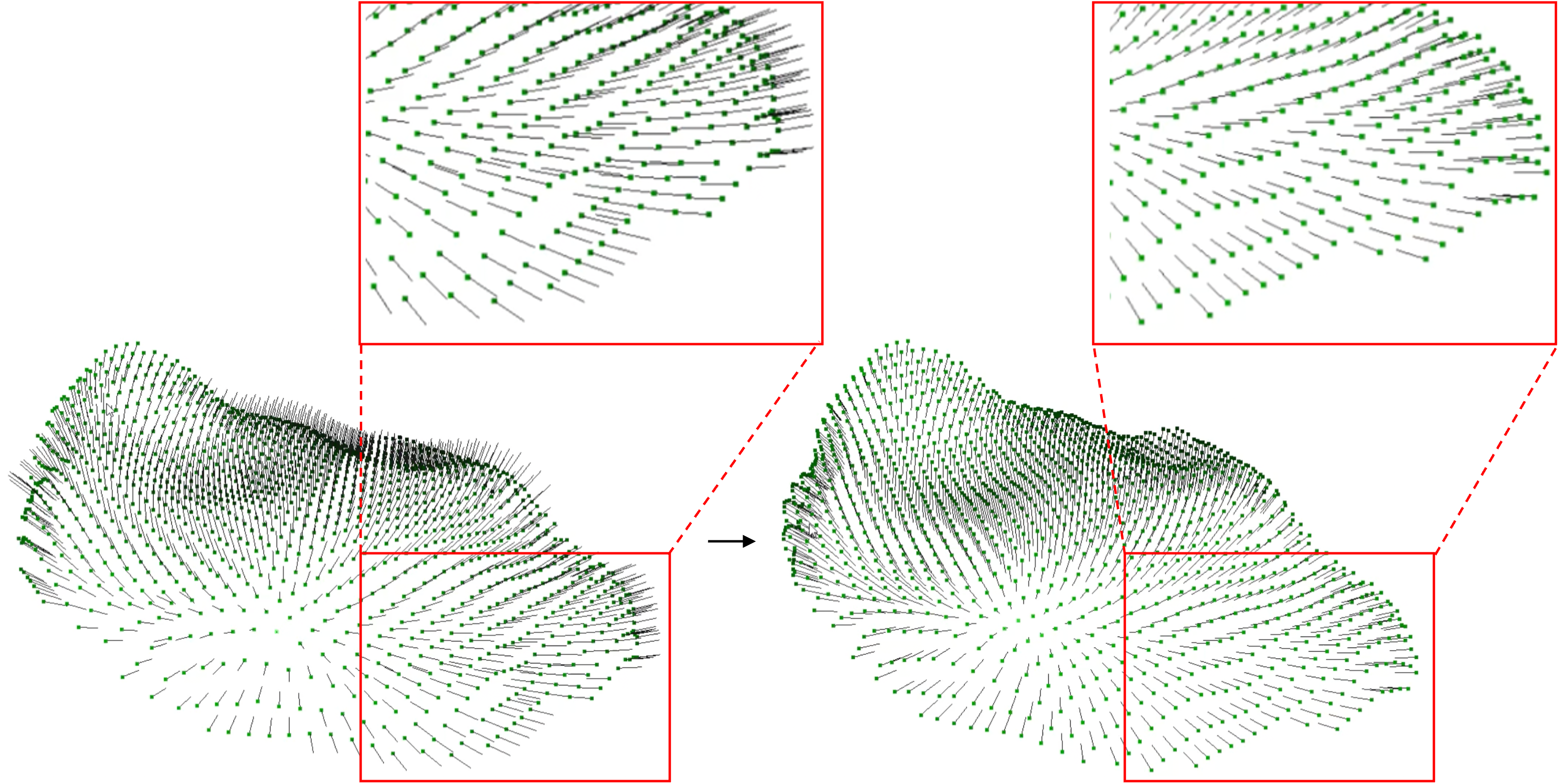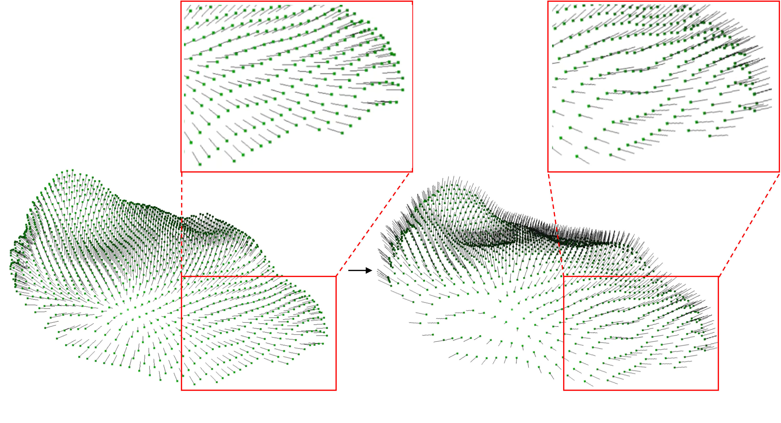 앞서 언급했듯이 저는 표면의 방향을 알기위해 법선벡터를 계산하였습니다. 하지만 각 점에 생성된 법선벡터의 방향이 일관되지 않게 생성되는 문제가 발생하였습니다. 제가 사용한 데이터는 샘플링 등의 후처리 과정을 거치지 않은 원본 point cloud 데이터이기 때문에 점들의 밀도가 일관되지 않습니다. 이렇게 균일하지 않은 샘플링 밀도를 가진 point들 사이에서는 법선 추정이 일관되게 계산되지 않을 수 있습니다. 저는 이를 해결하고자 최소 스패닝 트리를 사용하여 법선 방향을 전파하는 방법을 사용해보았습니다.