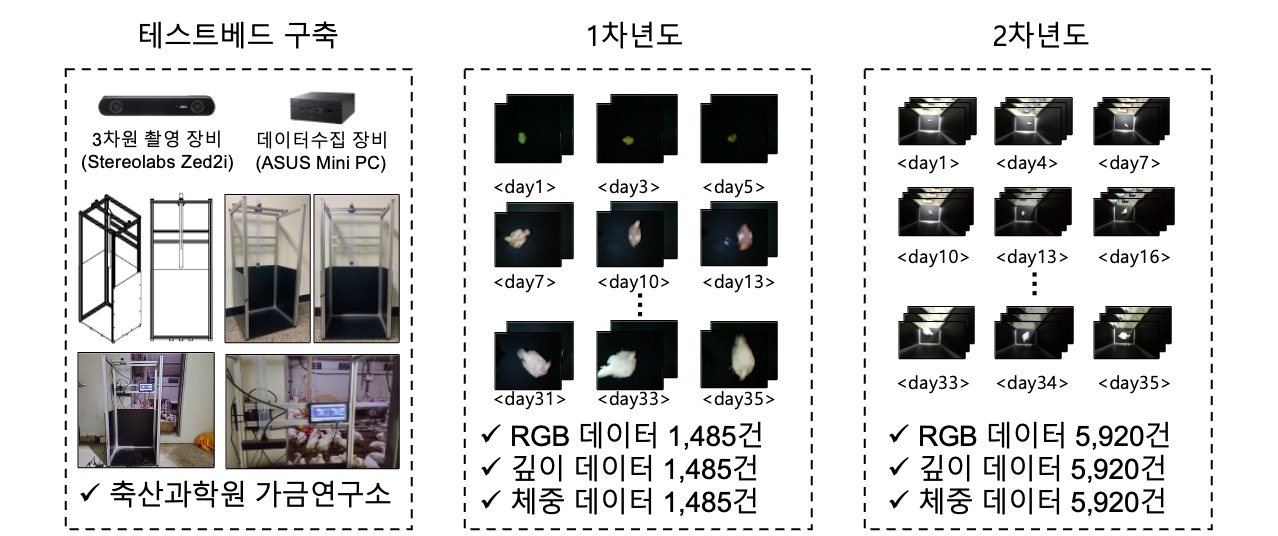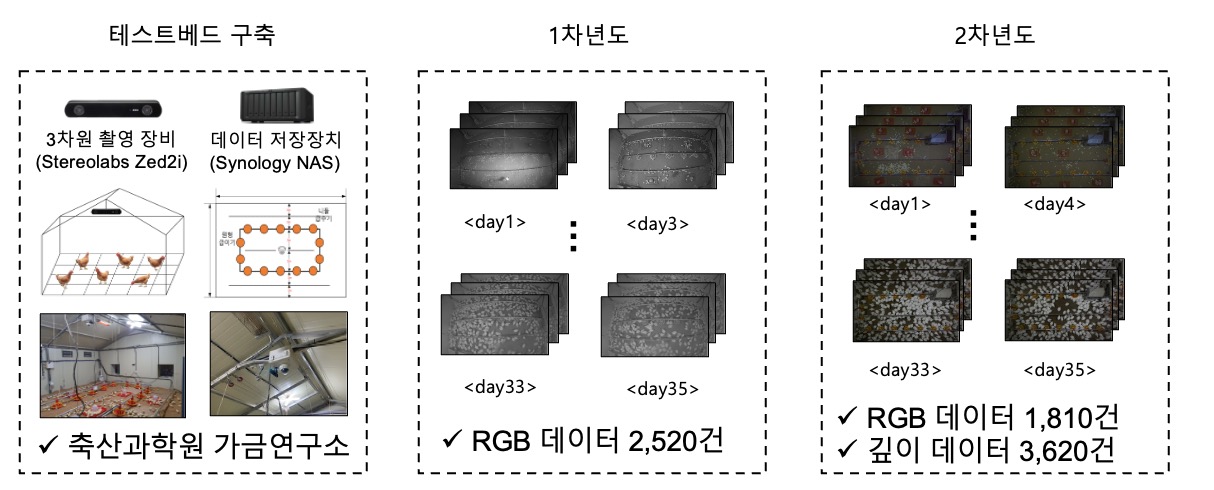 군집 육계 데이터(RGB, 3D 깊이, 체중)를 수집하기 위해 국립축산과학원 가금연구소에 실험 테스트베드(그림 4, 왼쪽)를 구축하였습니다.