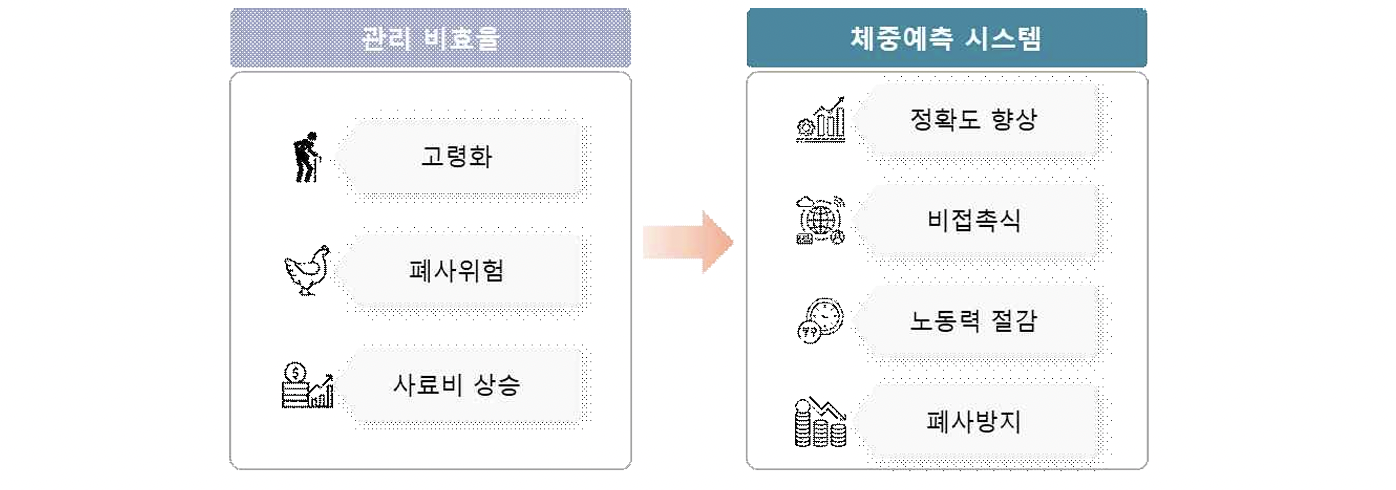 - 따라서 닭에게 전염병 및 스트레스를 최소화할 수 있도록 하는 비접촉방식, 적은 노동력과 많은 표본으로 평균 체중을 정확하게 측정할 수 있는 예측 시스템이 필요함