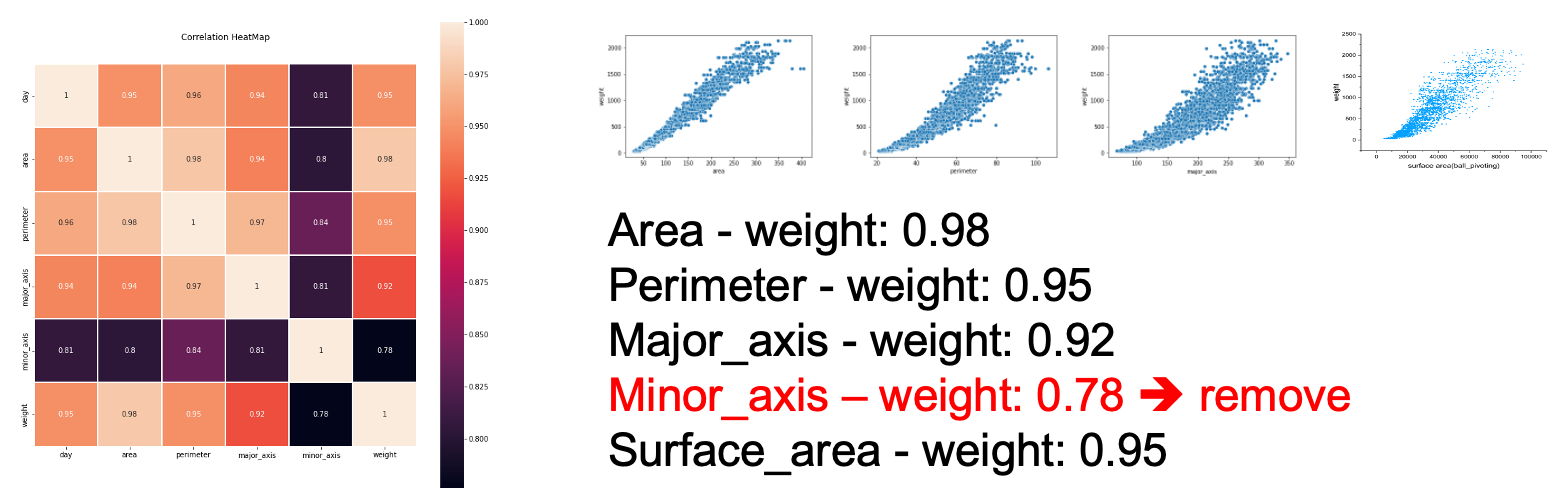육계의 다양한 생체지표(표면적, 부피, 머리 길이, 부리 길이, 몸통 길이, 키 등)와 무게 사이의 상관관계를 분석하여 3D 깊이 카메라로 측정할 수 있고, 체중과 유의미한 상관관계를 갖는 4가지 feature를 결정하였습니다.