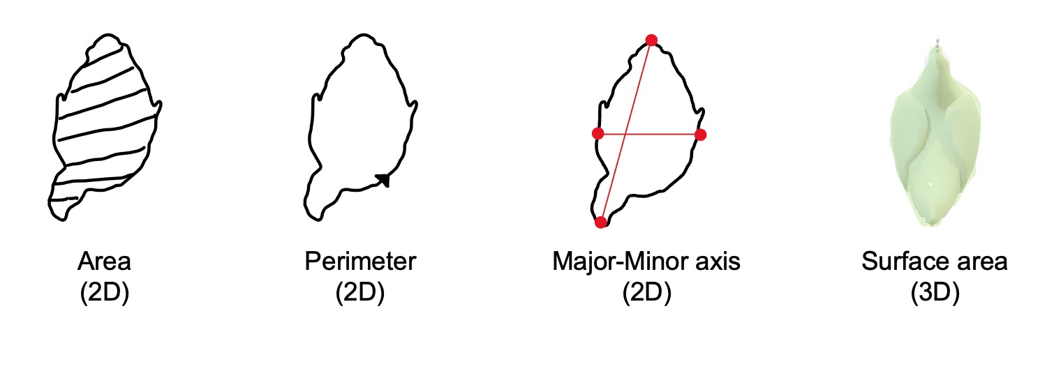 2D(투영 면적, 둘레, 장축,단축), 3D(표면적) feature 추출 알고리즘 개발