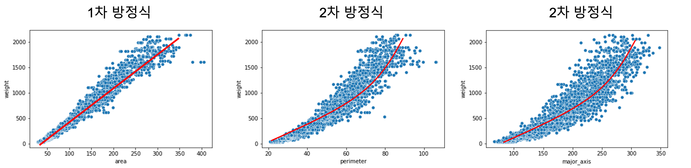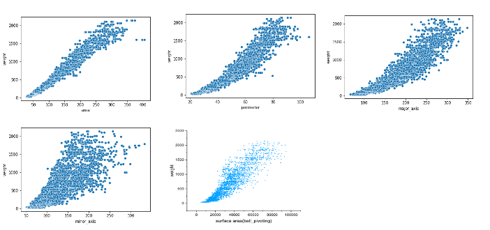 앞서 feature-체중 데이터 분포를 살펴보던 와중에 2D area는 1차식으로 회귀분석하면 되지만, 2D 둘레, 2D 장축과 같은 분포를 띄는 데이터는 1차식보다 2차식으로 회귀하는게 더 잘 예측할 수 있지 않을까? 라는 생각이 들었습니다.