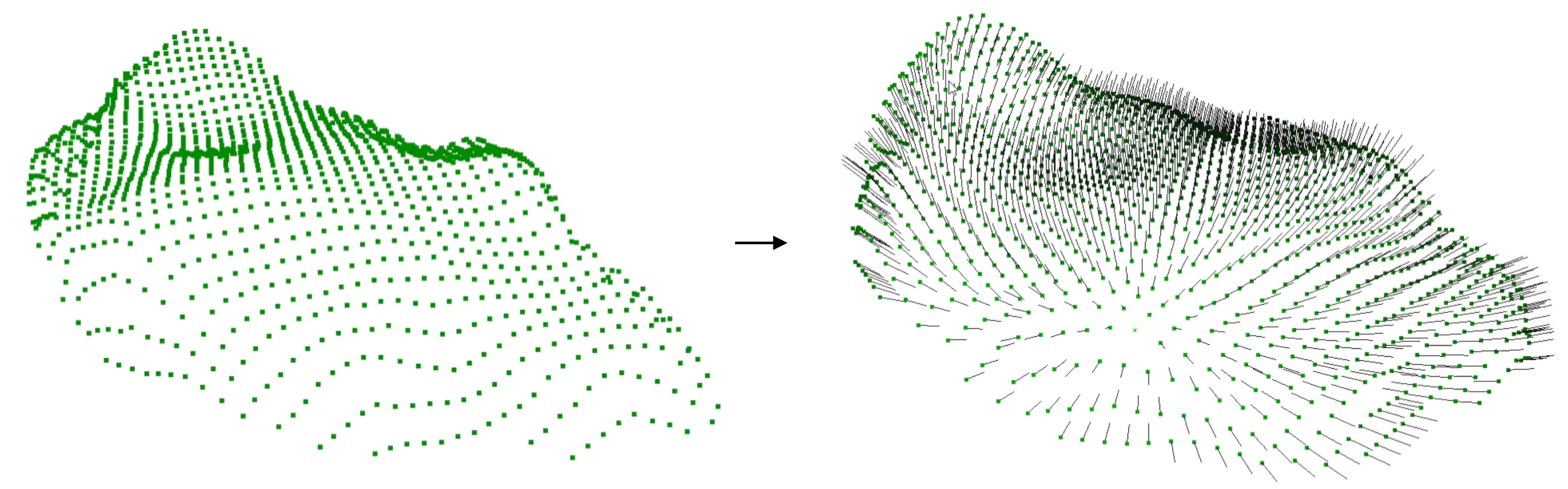 이렇게 얻어진 3D point cloud로 육계의 표면적을 계산할 수 있는데요. 3D point cloud에서 표면적을 계산하기에 앞서, 각 point가 속한 표면의 방향을 알기위해 point의 법선벡터를 계산하는것이 필수적입니다. 법선벡터를 계산하는 방법은 다음과 같습니다.