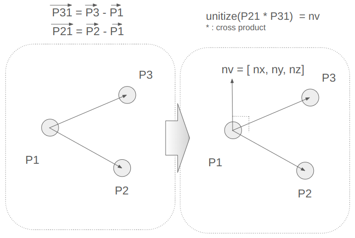 - P1으로부터 나머지 두 점(P2,P3)을 잇는 두 벡터를 구한다.