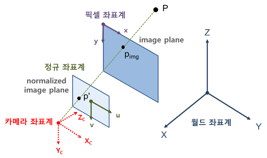 우리가 아는 Depth camera에는 크게 3가지 방식이 있다. 첫째, Streo 방식 둘째, ToF 방식 셋째, Lidar 방식 오늘은 위 세가지 방식들의 원리 및 장단점에 대해 공부하고 정리하려한다. 정리에 앞서 카메라 좌표계 시스템을 먼저 정의해야 할 것 같아서 정리하고 넘어가려 한다. 영상 geometry는 카메라 캘리브레이션, 스테레오 매칭 등 다양한 분야에 있어서 가장 기본이 되는 요소로서 geometry에 대한 이해 없이는 카메라의 동작방식을 제대로 이해할 수 없다. 0. 좌표계 영상 geometry에는 크게 4가지 좌표계가 존재한다. - 월드좌표계 - 카메라좌표계 - 정규좌표계 - 픽셀좌표계 월드좌표계와 카메라 좌표계는 3차원 좌표계이고 정규좌표계와 픽셀좌표계는 2차원 좌표계이다. 0.1..